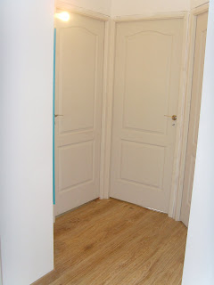 Le couloir ... sur le pan de mur à gauche, sera posé une tapisserie "peau de crocrodile" bleu turquoise (on aperçois le miroir de la même couleur)