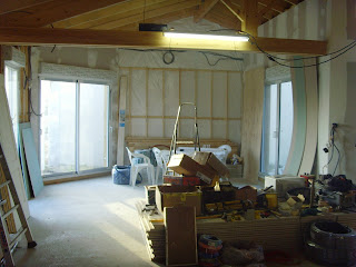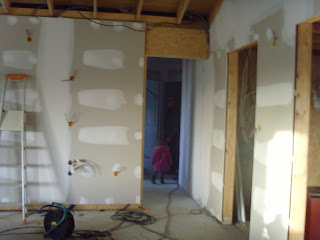 Vue sur la future cuisine (l' evier sera face à la fenetre) on peut aussi voir la baie à galandage.